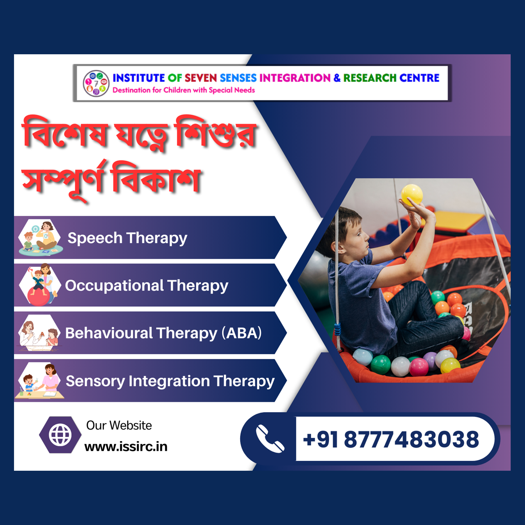 The INSTITUTE OF SEVEN SENSES INTEGRATION & RESEARCH CENTRE (ISSIRC) in Bankura is dedicated to empowering children with special needs. We offer ABA therapy, speech therapy, occupational therapy, and special education to help children overcome developmental challenges. Our expert team provides personalized care in a nurturing environment, fostering growth and independence. We are committed to building brighter futures through holistic support and compassionate guidance.